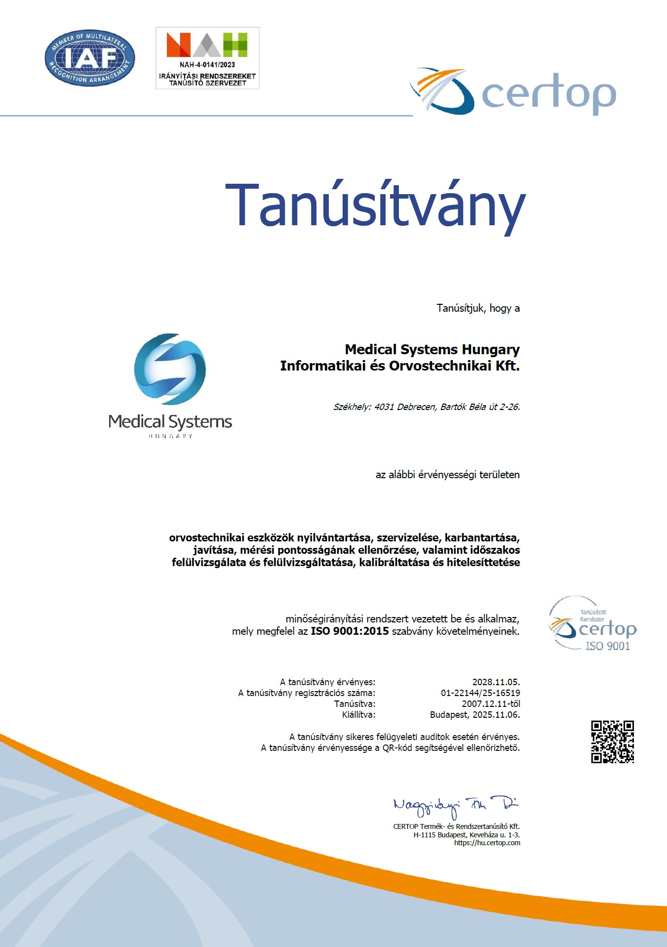 A fenti célok megvalósítása érdekében működtetjük és folyamatosan továbbfejlesztjük az orvostechnikai eszközök nyilvántartása, szervizelése, karbantartása, javítása, mérési pontosságának ellenőrzése, valamint időszakos felülvizsgálata és felülvizsgáltatása, kalibráltatása és hitelesíttetése tevékenységi körben az MSZ EN ISO 9001:2015 és az MSZ EN ISO 13485:2016 szabványok szerinti minőségirányítási rendszereinket.